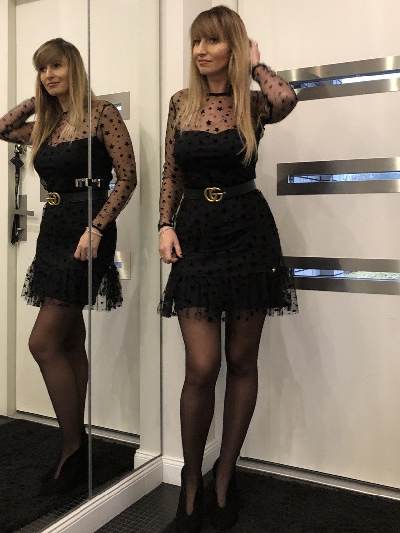 Przyciągająca wzrok czarna sukienka w gwiazdki z falbanką u dołu sukienki. Uszyta z elastycznej siatki w gwiazdki. Posiada podszewkę. Z tyłu zapinana na guzik. Wyprodukowana w Polsce. Skład: 95% poliester 5% spandex Wymiary: S/M Długość całkowita: 92 cm M/L Długość całkowita: 93 cm Produkt można prać ręcznie w temperaturze 30 st. C.