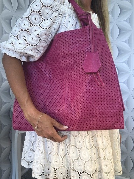 Rewelacyjna torebka z najwyższej jakości skóry naturalnej w kolorze fuksji, z trzema kieszonkami w środku. Zamykana na zamek. Nienaganne szycie i łączenia sprawiają, że torebka wygląda perfekcyjnie. Idealna do codziennych stylizacji.